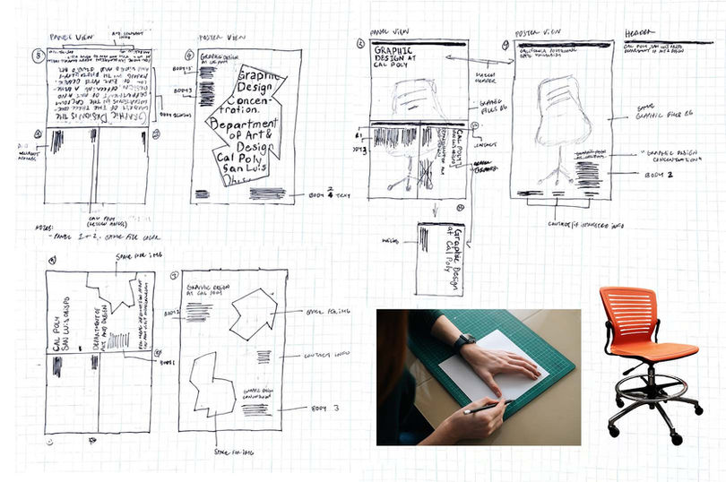Each panel contains pertinent information regarding the program and its features. A primary focus of the visual language to convey the fundamental, human-centered appraoch to graphic design at Cal Poly through the use of geometric shapes and Cal Poly inspired reference material (see process). Finally, a digital poster design was developed to accompany the brochure.